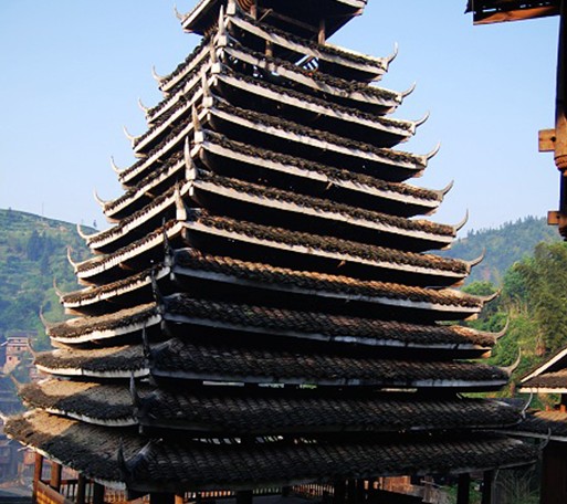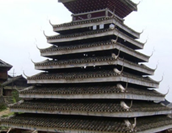 苗族鼓樓在臺江縣城東南方20公里的排羊鄉(xiāng)九擺村上寨中間,樓旁古木參天,蒼翠綠郁。 鼓樓為三重檐歇山頂屋面,木結(jié)構(gòu)建筑,覆蓋小青瓦,其 下層呈平面四方形,空間寬敞。樓高11米,占地52平方米,整 個建筑結(jié)構(gòu)以中間獨柱為中心,周圍16根外環(huán)檐柱為襯。利用 逐層內(nèi)收的粱、枋、瓜柱、檐柱支撐挑出屋檐。結(jié)構(gòu)無一釘一 鉚,攆橫穿斜插,銜接緊密牢固。前后留進出通道。