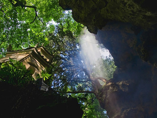 原廟傳為苗民草創(chuàng),每年農(nóng)歷“四月八”,數(shù)萬苗胞聚集于此,跳笙、對歌、賽馬、斗雀,狂歡三晝夜。明王守仁勝贊之曰:“天下山水之奇聚于黔中,黔中山水之奇聚于此崖?!憋w云崖似洞非洞,內(nèi)甚寬敞。頂上崖檐覆出,石乳倒垂。浮者若飛霞,亙者若虹霓,豁然樓殿門闕,懸若銅鼓編磐,并有獅象蛟龍、蓮行阡陌、蜂房水渦之屬。其下澄潭邃谷,幽深無底。巖半立大士像。