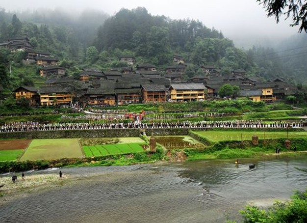 至今全寨有118戶,500多人,全部是苗族同胞,以陳、吳二姓為主。郎德上寨依山傍水,背南面北,四面群山環(huán)抱,茂林修竹襯托著古色古香的吊腳樓,蜿蜒的山路掩映在綠林青蔓中,悅耳動聽的苗族飛歌不時在曠野山間回蕩。寨前一條彎彎的河流宛如蛇龍悠然長臥,南面有松杉繁茂的“護寨山”,北面有楊大六橋---“風雨橋”橫跨于河畔上。過橋可攀登養(yǎng)牛坡,還可觀賞楊大六當年反清抗暴時筑起的碉堡和戰(zhàn)壕。寨內(nèi)吊腳樓鱗次柿比。吊腳樓上裝有“美人靠”供來客休息。“美人靠”平時又是姑娘們刺繡的好地方,具有獨特的苗寨風格。村上的小路全以鵝卵石鋪設(shè),整整齊齊干干凈凈。寨子中央有一個大蘆笙場,地面是用鵝卵石以仿古代銅鼓面十二道太陽光芒和飛奔的駿馬,南上方還設(shè)有“楊大六文物博物館”。館內(nèi)陳列著當年楊大六領(lǐng)導反清抗暴時的刀、叉、頭 盔、鐵炮等戰(zhàn)斗武器。原先苗族有自己民族文字,《苗族古歌》記載了苗族先民因逃避戰(zhàn)爭和朝廷的追殺與民族文化遷徙秘密等暴露予敵人,不得不將文字焚燒,抹去,當僅有的那些為數(shù)不多的知識分子去世后,文字也隨之丟失,留下的只有現(xiàn)在的那寫在衣服上的文字。當代苗族青年作家、知名記者南往耶這樣寫到:“苗族是一個不斷被驅(qū)趕甚至被消滅的民族,但他們一直沒有對信念和天主的放棄,自五千年前開始,爬山涉水,經(jīng)歷千難萬苦,從中原逃到云貴高原和世界各地,朝著太陽落坡的地方尋找故鄉(xiāng),用血養(yǎng)育古歌和神話,沒有怨恨,把懸崖峭壁當做家園,梯田依山而建,信仰萬物,崇拜自然,祀奉祖先,感謝仇人。”進郎德上寨,首先要飲十二道攔路酒,然后才沿著石板小路走進寨子中央的蘆笙場。在郎德將會欣賞到敬酒歌、苗族飛歌、蘆笙 舞、銅鼓舞、板凳舞、集體舞等豐富多彩的苗族民間歌舞。或許,這就是苗族的文字吧。