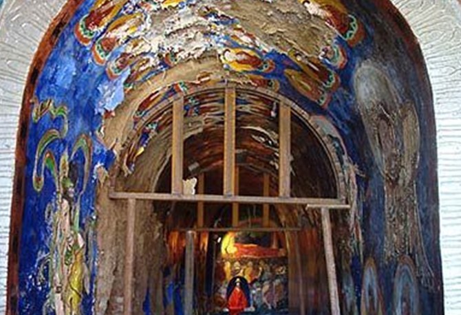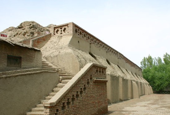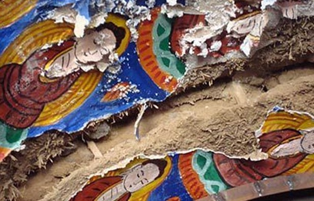 吉木薩爾千佛洞坐落在天山北麓距吉木薩爾縣城西南5km的黃土崗上,向北有小路與烏奇公路相通,交通便利.千佛洞建筑呈東西向的長(zhǎng)方形,東面有山門。正殿坐西朝東,土木結(jié)構(gòu),南北兩則建有配房,磚木建筑。正殿為一有斗拱的硬山頂建筑,分前、中、后堂三部分。前堂塑有丈許高的釋加佛像一尊,中堂面闊三間,繪有佛說法圖,18羅漢等塑像;后堂塑有臥佛一尊;三部分緊密相連,構(gòu)成一個(gè)整體。