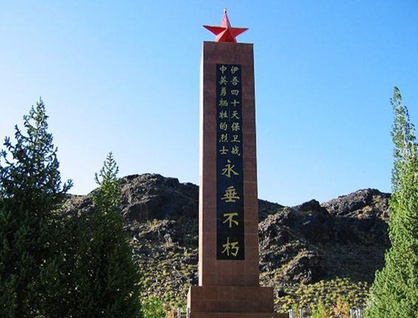 烈士陵園是伊吾人民為了緬懷在伊吾四十天保衛(wèi)戰(zhàn)中壯烈犧牲的革命烈士而建的。1950年春,在伊吾曾經(jīng)發(fā)生了震驚全國(guó)、震破敵膽的伊吾四十天保衛(wèi)戰(zhàn)。奉毛主席向新疆進(jìn)軍、屯墾戍邊的命令,我解放軍一營(yíng)二連全體官兵在全國(guó)戰(zhàn)斗英雄胡青山副營(yíng)長(zhǎng)的率領(lǐng)下先后進(jìn)駐伊吾。1950年的伊吾偽縣長(zhǎng)艾拜都拉與匪首烏斯曼、堯樂(lè)搏斯相勾結(jié),企圖以伊吾為據(jù)點(diǎn)發(fā)起大規(guī)模的武裝叛亂。解放軍進(jìn)駐伊吾后,兵分三路,一路由全國(guó)勞動(dòng)模范趙富貴連長(zhǎng)帶領(lǐng)進(jìn)駐淖毛湖,一路進(jìn)駐下馬崖,還有一路由胡青山副營(yíng)長(zhǎng)駐扎在縣城。解放軍進(jìn)駐伊吾后叛匪加快了叛亂活動(dòng),他們秘密切斷了電話線、破壞了交通、裹脅走了縣城的所有居民,我解放軍一營(yíng)二連就是在這種內(nèi)無(wú)群眾支持、外無(wú)援軍的情況下,監(jiān)守山城四十個(gè)日日夜夜,終于堅(jiān)持到大部隊(duì)援軍的到來(lái),取得了伊吾四十天保衛(wèi)戰(zhàn)的全面勝利。彭德懷總司令發(fā)來(lái)慰問(wèn)電嘉獎(jiǎng)二連,并且被解放軍西北軍區(qū)第一野戰(zhàn)軍授予“鋼鐵英雄連”的光榮稱號(hào)。