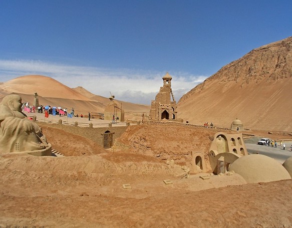 大漠土藝館文位于新疆吐魯番火焰山下。煙云繚繞的火焰山下,郁郁蔥蔥的木頭溝河畔,一座規(guī)模宏大的人文景觀以其獨特的藝術風格,屹立在312國道西側,它就是1991年5月對外開放接待游人的新疆火焰山大漠土藝館,地理坐標89°32″7′,42°56″8′,海拔140米。這里是火焰山腹地的五百羅漢谷,是佛光寶地。眾所周知,自古名山僧占多,火焰山也不例外,著名的佛教遺址--柏孜克里克千佛洞就開鑿在此谷,在古代是高昌回鶻王國的王家寺院。想當初也是雕梁畫棟、金碧輝煌,因歷史上的宗教戰(zhàn)爭,人為和自然的破壞摧殘早已瘡痍滿身、面目全非,引發(fā)了人們無限的歷史感慨,也深深地觸動了藝術家張文閣的心靈。他發(fā)誓要使西域文化在火焰山再現(xiàn)輝煌。他離妻別子,四處籌借,帶領同伴歷經(jīng)十余載終于建成了新疆大漠本土藝術博物館。給荒漠寂僻的火焰山增添了一道亮麗的色彩。土藝館把建筑、壁畫和雕塑融為一體,歷史文化勝跡和自然景觀交相輝映,把地面景觀和地下洞窟有機地結合在一起,雄渾粗獷、大氣磅礴,把奇特雄偉的大漠風采表現(xiàn)得淋漓盡致,使蜚聲海內外的大漠生土藝術在吐魯番火焰山這一特殊環(huán)境里發(fā)揚光大。