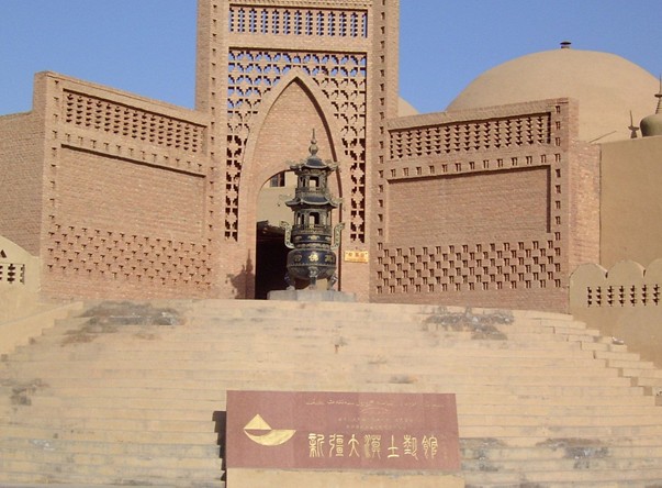 從312國道的勝金口往北拐上前往柏孜克里克千佛洞的旅游專線公路四公里處,便可看到千平方米的大型停車場后的高坡上矗立著一座高大的民族風格建筑群,正中是十四米高的磚砌圖案大門,這就是大漠土藝館的正門。走進大門,迎面可見三座互相連通的穹頂,穹頂頂端和四周布滿了小塔,好似金鋼寶座塔廟,這就是恢宏巨制的古代佛教藝術館---萬佛宮,是大漠土藝館的主體工程。這個大型宮堡由三個直徑十米、高十二米的窟窿頂建筑組成,是迄今新疆境內最大的佛教藝術殿堂。據(jù)考古學家發(fā)現(xiàn),新疆古代的佛寺不少就是采用了這種式樣的建筑。有趣的是,世界三大宗教:基督教、佛教、伊斯蘭教都對窟窿頂建筑情有獨鐘。進入宮內迎面一尊十米高的彩繪大佛雄偉壯觀、氣派不凡,是依據(jù)焉耆出土的雕塑精品紅衣佛放大塑造的。東西二廳的壁畫以拜城克孜爾千佛洞、吐魯番柏孜克里克千佛洞珍寶穹被盜走和損毀嚴重的壁畫為藍本,由專家研究考證、復原繪制出的,新疆境內有代表性的古代佛教壁畫一千二百余平方米,都覆蓋在宮內自地面到頂端的墻壁上,工程巨大,耗時四載。來此參觀的游客足不出宮便可盡覽新疆古代佛教藝術的大略。