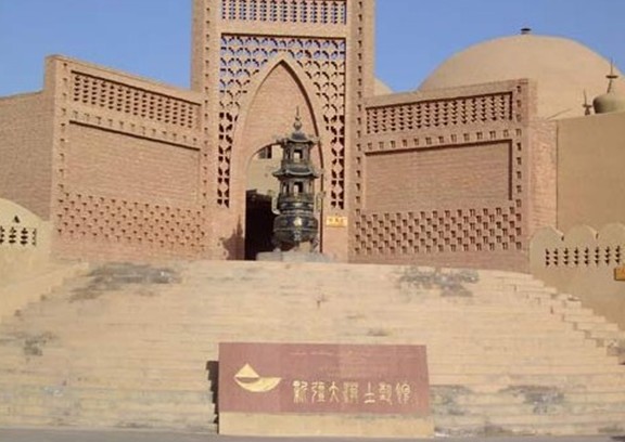 煙云燎繞的火焰山下,郁郁蔥蔥的木頭溝畔,一座規(guī)模宏大的人文 景觀,以其獨特的藝術(shù)風(fēng)格,屹立在312國道西側(cè),它就是1991年5月對 外開放接待游人的新疆大漠土藝館, 地理坐標89°32′7″E,42°56′ 8″N,海拔140米,由312國道的勝金口往北拐上前往柏孜克里克干佛洞的旅游專線公 路四公里處,便可看到大型停車場后的高坡上矗立著一座高大的民族風(fēng)格建筑群,正中是十四米高的磚砌圖案大門.
