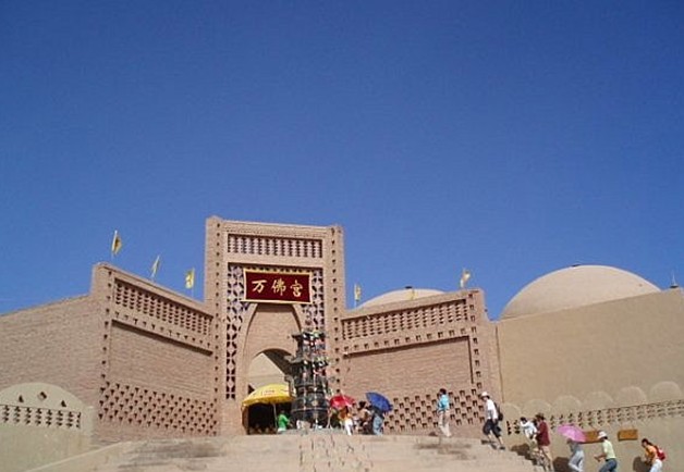煙云燎繞的火焰山下,郁郁蔥蔥的木頭溝畔,一座規(guī)模宏大的人文 景觀,以其獨特的藝術(shù)風(fēng)格,屹立在312國道西側(cè),它就是1991年5月對 外開放接待游人的新疆大漠土藝館, 地理坐標89°32′7″E,42°56′ 8″N,海拔140米,由312國道的勝金口往北拐上前往柏孜克里克干佛洞的旅游專線公 路四公里處,便可看到大型停車場后的高坡上矗立著一座高大的民族風(fēng)格建筑群,正中是十四米高的磚砌圖案大門,一看便知是吸收維吾爾建 筑風(fēng)格和吐魯番葡萄晾房而設(shè)計的,這就是新疆大漠土藝館。進得大門便是幾座大小不一、錯落有致、下方上圓的穹窿頂建筑,一股西域所特有的神秘氣息撲面而來,誘人遐想。穿過前院,迎面是三座互相連通的穹頂,穹頂四周布滿小塔,酷似金剛寶座塔廟,這就是恢宏巨制萬佛宮,是大漠土藝館的主體工程。這個大型宮堡由三個直徑十米、高十二米的穹窿頂建筑組成,是迄今新疆境內(nèi)最大的古代佛教藝術(shù)殿堂。
