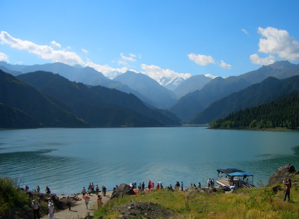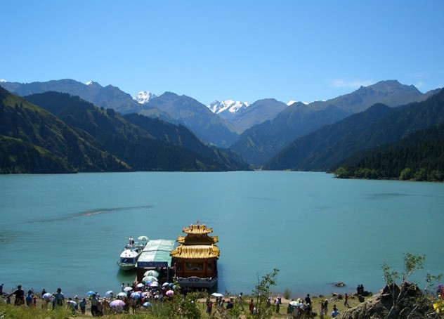 天山天池位于博格達峰北坡,海拔1900多米,系高山融雪匯集而成。傳說王母娘娘曾在此沐浴,故稱瑤池。天池風景區(qū)以天池為中心,融森林、草原、雪山、人文景觀為一體,形成別具一格的風光特色。天池共有三處水面,除主湖外,還有東側的東小天池,古名黑龍?zhí)丁L断聻榘僬蓱已?,有瀑布飛流直下,恰似一道長虹依天而降,煞是壯觀。