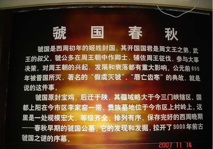虢國是西周初年的姬姓封國。其開國國君是周文王之弟,武王的叔父。虢公多在周王朝中作卿士,輔佐周王征伐,參與大事決策,對周王朝的興起、發(fā)展和衰落都有重大影響。公元前655年被晉國所滅,著名的"假虞滅虢"、"唇亡齒寒"的典故,就是說的這件事。