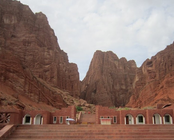 大峽谷近似呈南北弧形走向,開(kāi)口處稍彎向東南,末端微向東北彎曲,由主谷和七條支谷組成,全長(zhǎng)5000多米,谷端至谷口處自然落差200米以上,谷底最寬53米,最窄處0.4米,僅容一人低頭彎軀側(cè)身通過(guò)。谷側(cè)奇峰嶙峋,爭(zhēng)相崛起;峰巒疊嶂,劈地摩天,崖奇石峭,磅礴神奇;神洞秘窟,各蘊(yùn)其意。谷內(nèi)蜿蜒曲折,峰回路轉(zhuǎn);步步有景,舉目成趣;泉水叮咚,鳥(niǎo)叫蟬鳴,寒暑不浸,游人稱(chēng)絕。整個(gè)峽谷猶如一條尾震天山頭,口飲庫(kù)河流(開(kāi)口于庫(kù)車(chē)河),曲身九十九的巨龍劈山而臥,呼風(fēng)喚雨,神秘莫測(cè)。更令人稱(chēng)奇的是,距谷口1400米深處,高約35米的崖壁上,有一始建于盛唐時(shí)期,壁畫(huà)丹青的千佛洞遺址,就文字記載和繪畫(huà)藝術(shù)而言,在古西域地區(qū)至今已發(fā)現(xiàn)的300多座佛教石窟中絕無(wú)僅有,實(shí)屬罕見(jiàn)。無(wú)山不成谷,峰奇谷更幽。峽谷區(qū)域平均海拔1600米,最高山峰2048米。組成峽谷的奇峰群山由赭色的泥質(zhì)沙巖構(gòu)成,當(dāng)?shù)鼐S吾爾語(yǔ)叫做“克孜利亞”,即紅色的山崖。神秘大峽谷正處在當(dāng)今中國(guó)九大影視基地之一的克孜利亞勝景中。龐大的紅色山體群形成于距今1.4億年前的中生代的白堊紀(jì),經(jīng)億萬(wàn)年的風(fēng)剝雨蝕,洪流沖刷,形成縱橫交錯(cuò),層疊有序的垅脊與溝槽,遠(yuǎn)看如詩(shī)如畫(huà),狀若“布達(dá)拉宮”,仙天瓊閣;近瞧若人似物,如夢(mèng)似幻,惟妙惟肖,神韻萬(wàn)端。令人有鬼斧神工,奇景天成之慨嘆。尤以谷口處的三座山體(乃頭山、麗人山、佛面山)最為壯觀。特別在夕陽(yáng)斜射,朝霞映山,極目遠(yuǎn)眺,色艷紅天。大有不是火焰山,勝似火焰山之奇感。