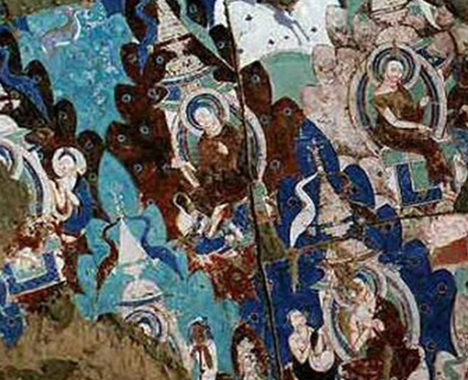 由于唐代是龜茲地區(qū)佛教的鼎盛時期,因此盛唐時開鑿的洞窟較多。在庫木吐拉石窟中,唐代的壁畫數(shù)量最多。它在內(nèi)容和畫風(fēng)上都和中原藝術(shù)比較接近。這一時期的主要特點是:既有中原畫那種豐富多變的線條,又有凹凸暈染法,并使二者有機地結(jié)合在一起,形成獨具一格的龜茲畫風(fēng)。它運用了富有裝飾性的圖案作背景,以寫實傳真的空間,來襯托虛幻的宗教故事。這種手法,大量地使用在滿鋪窟頂?shù)牧飧癖旧?、因緣故事畫和菱格雙幡復(fù)缽式塔內(nèi)的坐佛圖上。在橫豎斜向排列的菱格中,又畫出層層山峰,其間點綴著圖案化了的樹木、花卉、水池,再彩繪以形象生動、造型優(yōu)美的佛本生或因緣故事畫,使之動靜結(jié)合,圖案與寫實相呼應(yīng),主題形象突出,色彩濃淡相宜,畫面絢麗多彩,又富有裝飾意匠。