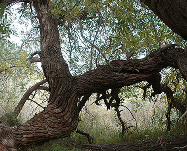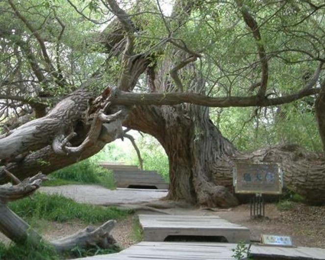 墓地周圍為戈壁荒丘,圓中卻以美麗奇特的大自然風(fēng)光、豐富多彩的植物資源、古樸淳厚的少數(shù)民族文化而享有盛譽(yù)。園中的樹木種類很多,有楊樹、榆樹、柳樹、白蠟樹、還有核桃、杏樹等。那些蒼勁的古樹,有的曲折盤旋,貼地而伸;有的匍匐在地,猶如龍蛇之狀;有的軀干壯碩穩(wěn)固,枝條隨風(fēng)起舞;有的樹頭與根部相連,分不清哪是根,哪是枝;有的樹倒地后,又從根部生出新枝,筆直向上,長(zhǎng)成參天大樹。園中有一棵斜長(zhǎng)的大樹,根部早已腐朽,而樹冠依然生機(jī)勃勃。園中最高大的一棵楊樹,據(jù)資料介紹高96.23米,直徑6.25米。