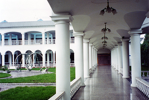伊甸宮:一座中西合璧的建筑,中國傳統(tǒng)的庭院式與歐式建筑的線條、廊柱建筑風格相結(jié)合。通長的圍廊,漢白玉石柱,具有良好的裝飾性和使用功能,使您的戶外活動不受氣
