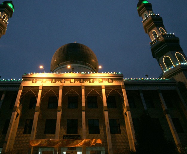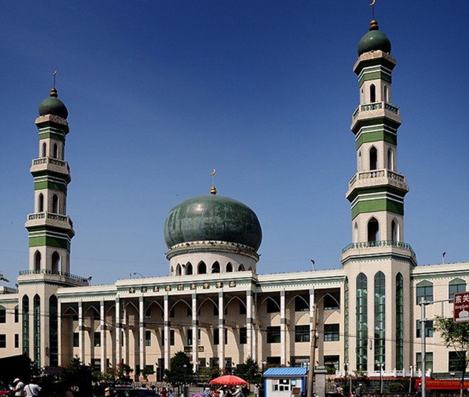 庫爾勒清真大寺位于庫爾勒市中心"老城"地方,1987年重建,規(guī)模宏偉,整潔寬敞,裝飾華麗,建筑風(fēng)格頗新穎。殿堂、院內(nèi)可同時容納7千僑匯人作禮拜。迎街門樓高25米,分7層,每層有房間若干,為阿訇、毛拉司事休憩之處。殿堂內(nèi)設(shè)冷風(fēng)機(jī),頂棚高懸吊燈、吊扇。四壁繪有維吾爾風(fēng)格的圖案,版權(quán)所有山東聊城聊之旅國際旅行社有限公司,轉(zhuǎn)載必究!并書寫了許多《古蘭經(jīng)》文。