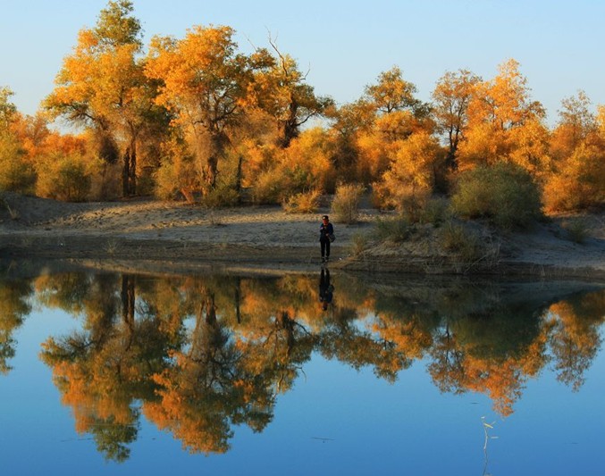 曠野上隨處可見(jiàn)輪臺(tái)油田高聳藍(lán)天的井架、排列齊整的鉆機(jī)和車隊(duì)以及井口噴射的朵朵烈焰,使昔日覺(jué)寂的荒原,充滿活力和生機(jī)。該公園現(xiàn)建有木頭賓館、磚砌的四合院接待站和食堂,可解決旅客的食宿。公園接待站后院高聳著一座二三十米高的了望鐵塔,登上塔頂,但見(jiàn)蔚藍(lán)的塔里木河蜿蜒曲折,散成眾多的汊流,汊流間布滿胡楊林。胡楊林海,順著塔里木河一直伸向茫茫天際,好不壯觀!森林公園色彩絢麗多變,綠樹(shù)、碧水、藍(lán)天,猶如一幅濃重的水墨畫(huà)。秋初黃綠相間,深秋一片金黃。公園中建有水榭、湖心亭,備有游船、汽艇可供開(kāi)展巡河觀光。這里的河汊全長(zhǎng)7千米,開(kāi)始段呈長(zhǎng)圓開(kāi)如湖蕩,水中建有湖心亭,各種水鳥(niǎo)珍禽集隊(duì)飛翔鳴啼在湖面和森林中,湖中樹(shù)木倒影清晰,環(huán)境靜謐,空氣清新,漫步湖濱,令人心曠神怡;河汊中間段水面寬闊,汪洋一片,水波蕩漾,水中到處布滿奇開(kāi)怪狀的枯樹(shù)與樹(shù)樁,船行其間猶如穿梭在梁山泊的水寨間,別有情趣,河汊末端水道收縮變窄,形成條條港汊,水流紋絲不動(dòng),水平如鏡,河汊兩邊的胡楊林連同藍(lán)天白云倒映水中,其影像比明鏡中的影子還要清晰逼真,令游人叫絕;河汊末端是蘆葦蕩和胡楊紅柳沙丘群,潔白的葦花蕩和胡楊紅柳沙丘群,潔白的葦花在逆光透射下發(fā)出誘人的銀白色光芒;牛、羊群悠閑地覓食在紅柳沙包中。登上沙丘頂,向南望,胡楊林一眼望不到邊;向北遠(yuǎn)眺,沙漠油井噴射的火焰映紅了藍(lán)天。這如詩(shī)如畫(huà)的美景迷倒了無(wú)數(shù)的游人,令人流連忘返,特別是那些攝影愛(ài)好者和畫(huà)家,在這里一住就是一周甚至半月。