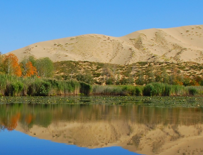 白沙湖,湖面只有0.5平方公里。是個(gè)獨(dú)立于浩瀚沙漠中的原生態(tài)沙漠湖,沒有進(jìn)水與出水口,沙漠里一般蒸發(fā)量都比較大,但這里的水位多年來卻沒有變化,更不因季節(jié)變遷而增多或減少。景致構(gòu)成十分獨(dú)特,湖中四周生長著高達(dá)1—4米的密密叢生的蘆葦、菖蒲等水生植物,湖中還有野荷花孤寂地生存著;湖周50米內(nèi),是高大茂密的楊樹、白樺混生的林帶。