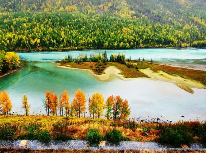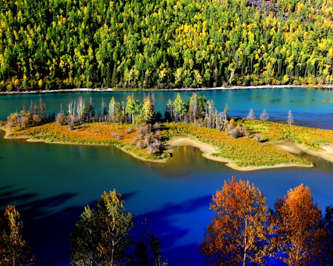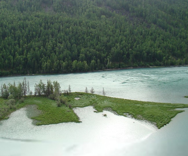 喀納斯河河水從河灣的西北角流入臥龍灣,進水處巨石抵中流,激浪拍巨石,玉珠飛濺。由于河灣開闊,河流在此流速減緩,水面微波浮動,碧藍潔凈,清澈透明,熠熠閃光。湖四周森林茂密,繁花似錦,綠草如茵,湖中小島景色秀麗。湖的泄水口有座木橋飛架東西,站在橋上向北是一平如鏡的臥龍灣,向南是奔騰咆哮的喀納斯河。灣內(nèi)的湖心島猶于一條巨大的臥龍。