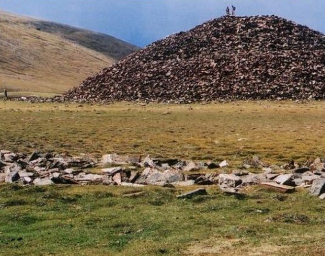 三海子墓葬及鹿石位于新疆維吾爾自治區(qū)青河縣查干郭愣鄉(xiāng)三海子夏牧場,為青銅時代的一處墓葬,距今約4000年。在面積約16.25平方公里地域的四個分布區(qū)內(nèi)計有石圍石堆墓、石棺墓30余座,鹿石19通。什巴爾庫勒石圍石堆墓,石堆直徑78米,殘高25米;石圍直徑210米,寬3~5米。石堆與石圍之間有四條片石鋪成的通道,最寬的通道達1.6米。墓環(huán)水而建,氣勢宏偉,結構獨特,是歐亞草原少有的特大規(guī)模墓冢之一。