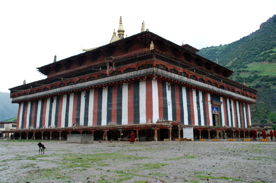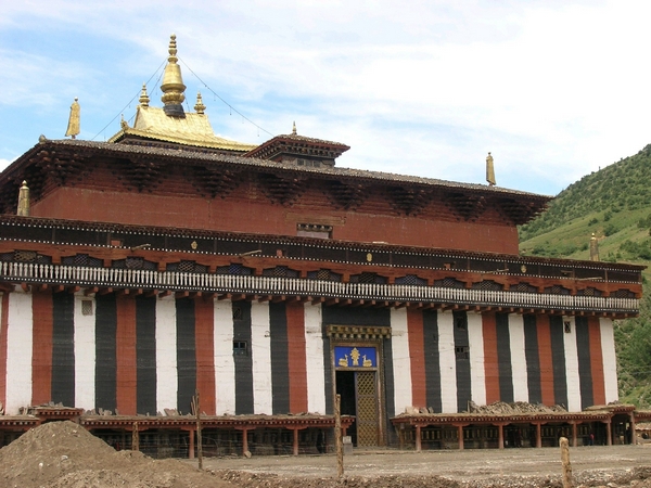 大殿坐西朝東,總建筑面積3334.64平方米。建筑主體呈四方形,邊長53米,殿內(nèi)柱子林立,共聳立180根柱子,其中64根柱子高約15米。殿堂為三層,高48.15米。下層樓見方長53米,中層每面長度為 40.30米,上層每面長度為12米。這些柱子將殿中的天窗托起,使得原本封閉的大殿,透漏出明亮的光線,較好的解決了藏式寺廟建筑中通風透氣不暢、光線不足的問題。