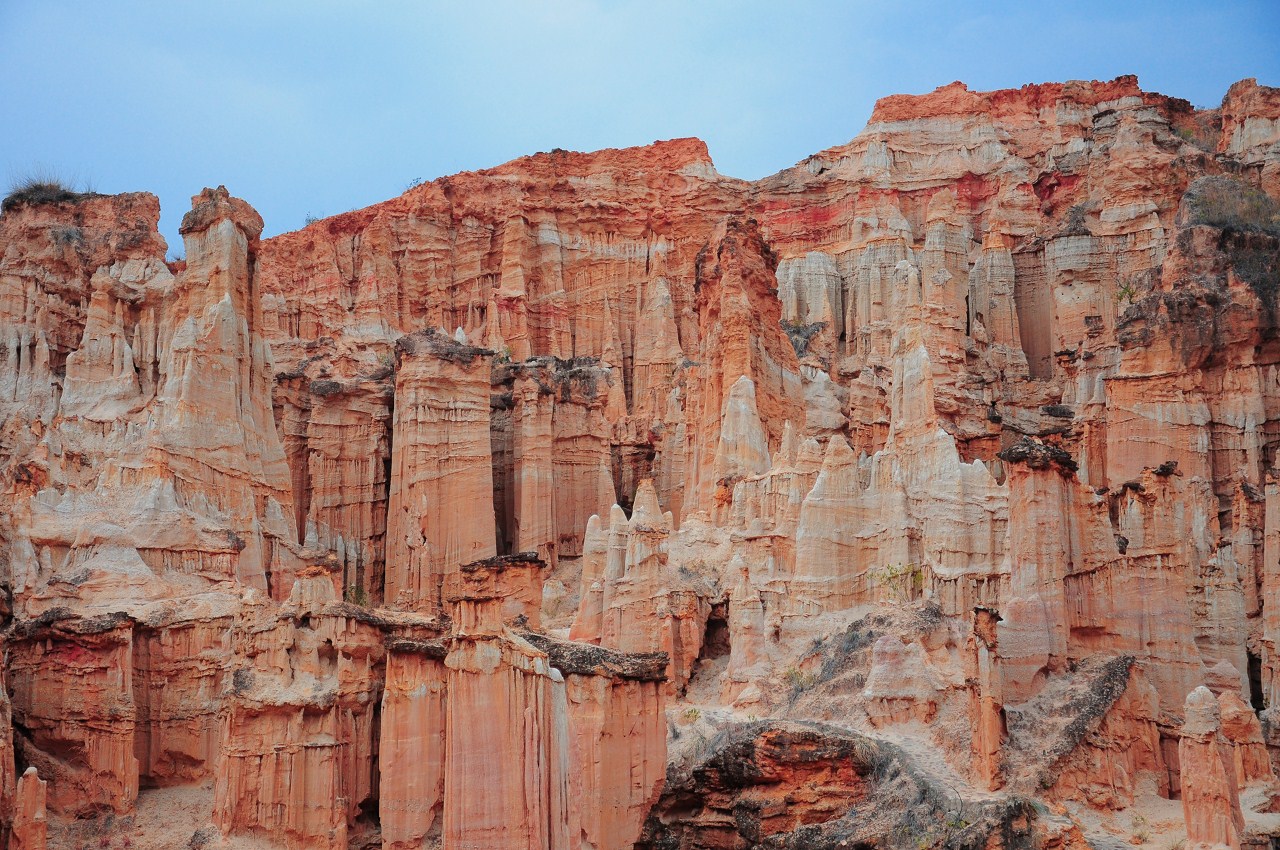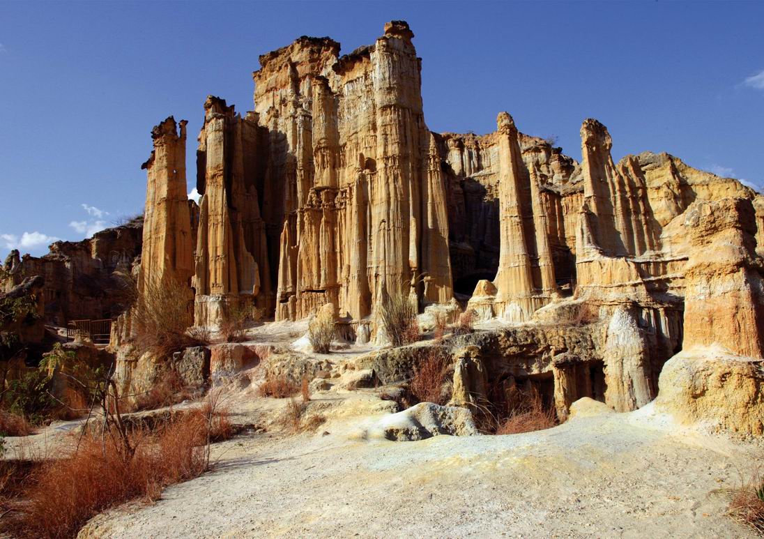 一踏進土林,那千姿百態(tài)的造型,就仿佛使人進入另一個新奇的天地。有的土柱如錐似劍,直指藍天;有的像威嚴武士,整裝待發(fā);有的如亭亭少女,凝視遠方;有的土柱頂上雜草叢生,間或長有野花;有的砂石壘壘,裸露身軀……當然,各種形態(tài)的土柱是混雜分布的,這就使得土林形成了豐富 多彩,變化層出不窮的姿態(tài),令人嘆為觀止。