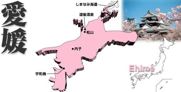 愛媛縣古稱伊予,位于四國(guó)西北部。北部偏東,南北走向細(xì)長(zhǎng)。面積約5677平方公里,居全國(guó)第25位。人口約143萬,居全國(guó)第27位。愛媛縣氣候溫暖,得天獨(dú)厚。由于坡地較多,雨水較少,適宜于果樹園藝和畜牧業(yè)的發(fā)展。下轄11個(gè)市9町?,F(xiàn)任知事中村時(shí)廣,2010年12月當(dāng)選。