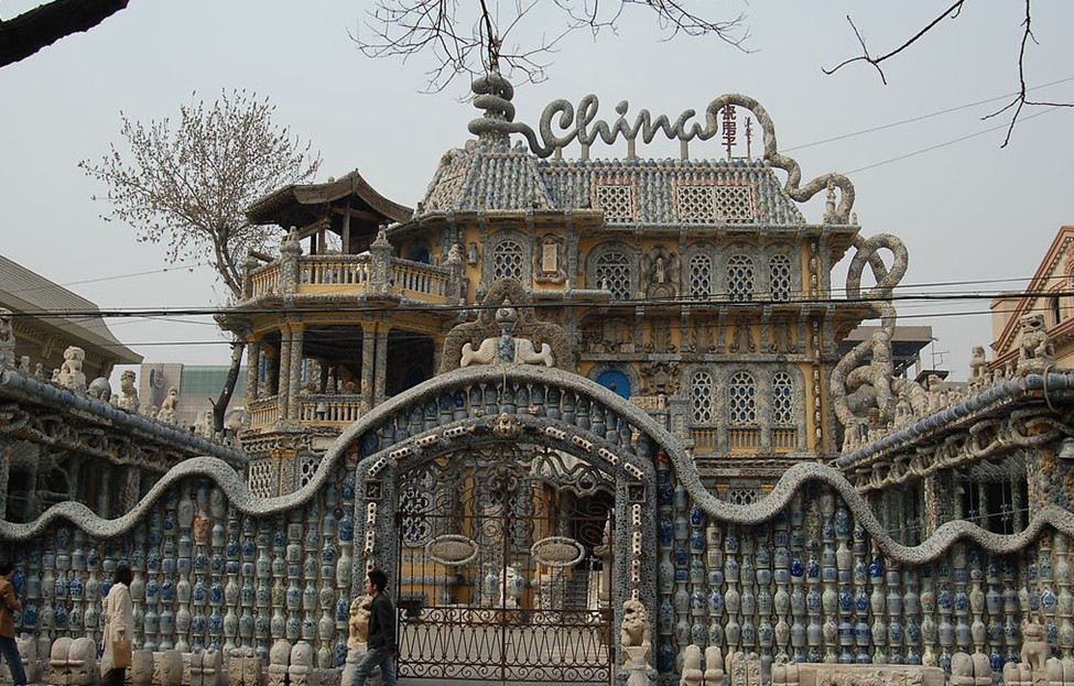 它將傳統(tǒng)元素與具有中國文化韻味的元素巧妙地糅合起來,比如:圍墻是“平安墻”,用的是大小不一的瓷瓶粘貼,取諧音“瓶”安墻而來。石造像、漢白玉石雕會在恰當?shù)臅r候與瓷片形成趣味組合,代表著時來運轉(zhuǎn)(諧音“石”)。