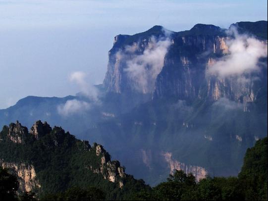 王莽嶺是陵川與河南輝縣的界山。山之東崖,俗稱(chēng)天柱關(guān),由高低錯(cuò)落的56個(gè)山峰組成。大者,峰頂可跑 馬,小者狀如筆尖聳立,有“駝鳥(niǎo)峰”、“一柱擎天峰”、“姊妹峰”、“天官賜福峰”、“龍泉寶劍峰”、“蓮花峰”、“仙女峰”等等,巍峨崢嶸。山南部千仞峭壁,如一石削成,“千峰爭(zhēng)攢聚,萬(wàn)壑絕凌歷”。北部巍巖相迭,青蓮秀出,群峰連綿。仰瞰之間,怪石嶙峋,濃綠淺翠,流泉飛瀑。晴日,千奇百怪的峰巖,青中帶紫,近看山形勾勒分明,遠(yuǎn)眺如畫(huà)中寫(xiě)意,朦朧如幻。 王莽嶺壯觀之處,莫過(guò)于日出。每逢晴日,峰巒沉浸在魚(yú)鱗般茫茫云海中,從灰蒙蒙至五色染云至金鱗閃耀,一輪紅日冉冉升起,一時(shí)間霞光萬(wàn)道,群山盡染,其磅礴輝煌之勢(shì),一如泰頂。