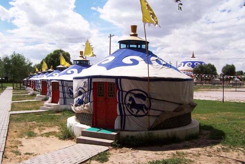 四、賽馬、摔跤、射箭場:從餐飲住宿部向東南行走500米,到蒙古族娛樂活動的中心,賽馬場,每年的那達慕大會就在這里召開。在高天的主席臺兩側(cè),排列著階梯形的觀禮臺。周長兩公里的封閉式賽馬道開闊平坦。騎手們穿著五彩繽紛的民族服裝,在賽道上飛奔,游人們情不自禁的跨上駿馬加入到賽馬的行列,一表騎馬風采。