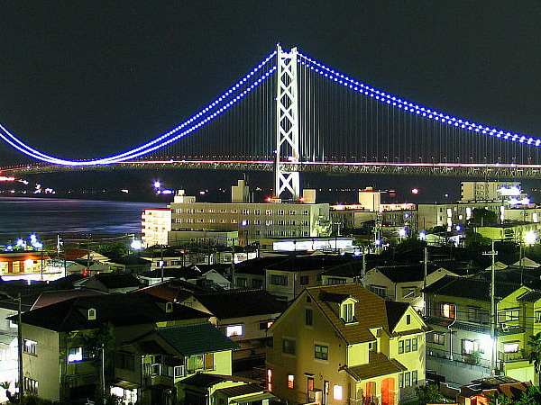 明石海峽大橋:連接本州島和淡路島的明石大橋,于1998年4月開(kāi)通,全長(zhǎng)3,911米,是世界上最長(zhǎng)的吊橋。夜晚時(shí)候開(kāi)起燈火,整座大橋猶如珍珠裝飾,故有“珍珠大橋”的美稱(chēng)。燈光的開(kāi)放十分講究,平日開(kāi)四季之顏色的燈,周末與節(jié)日開(kāi)藍(lán)綠色的燈。舉辦活動(dòng)時(shí),燈光顏色會(huì)不斷變化。報(bào)時(shí)的時(shí)候,整點(diǎn)是彩虹色、半點(diǎn)是寶石色。
