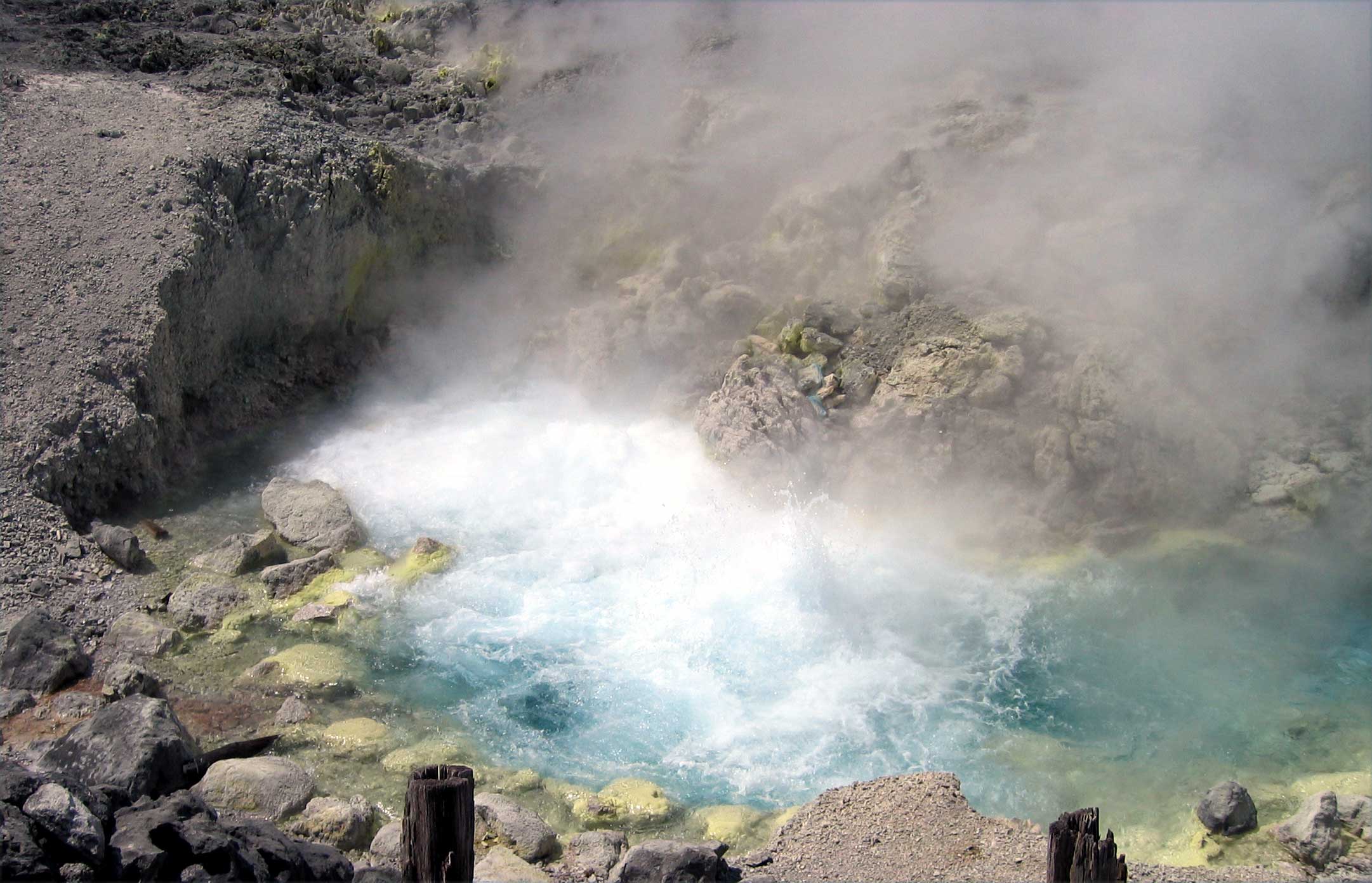 小安峽:斷崖的高度約60m,從裂隙開始到處彌漫著熱氣騰騰的蒸汽。從最大的“大噴湯”開始噴熱水。
