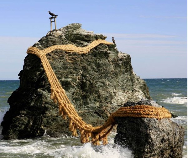 日本各地,有幾十個“夫婦巖”,以三重縣夫婦巖最為有名。由一根粗大的草繩海上一大一小兩塊礁石連結(jié)在一起,是喜結(jié)良緣、家內(nèi)安全的象征。兩塊礁石離岸邊660米,男巖高9米,女巖高4米。連結(jié)它們的稻草繩叫做“注連繩”,每年要更換三次。
