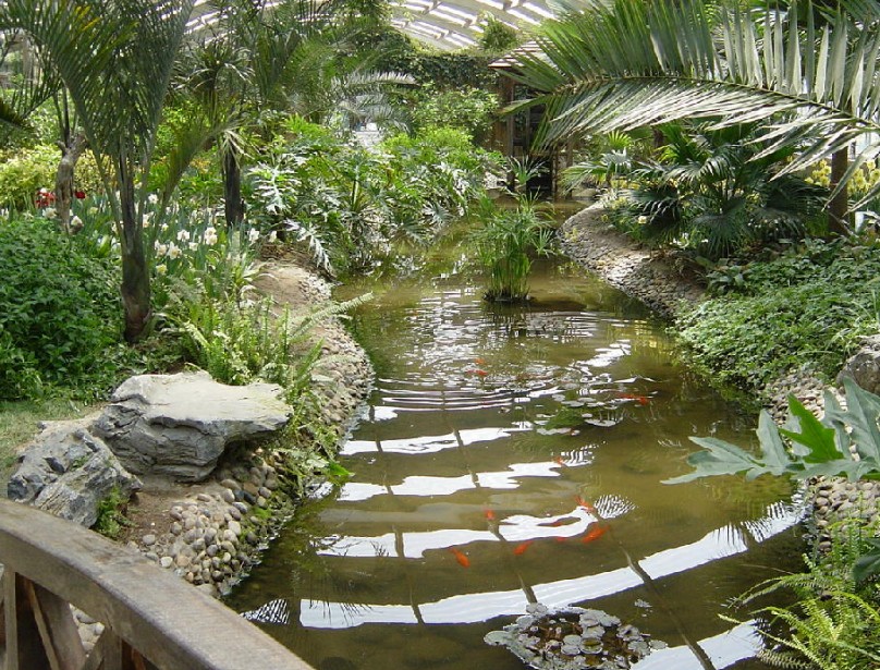 位于公園中部,溪流到此處寬狹不等,曲折多變。河兩岸群植竹、杉及灌木,河邊楊柳飄絲,南岸樹叢中隱現一只面積18.5平方米的竹亭。北岸有座呈直角形的綠蔭茶室,墻體為毛石砌就,外形樸素、粗獷,部分建筑伸出水面,有竹甬道與岸相聯,建筑面積350.25平方米。室內設裝飾壁爐,墻上懸掛獸頭鹿角,野趣盎然。景區(qū)南有座三孔石拱橋,長13米,寬3.1米;橋上的花崗石亭面積10平方米。過橋向西有組蘑菇亭,混合結構,面積共30.6平方米,亭下配有石桌石凳。