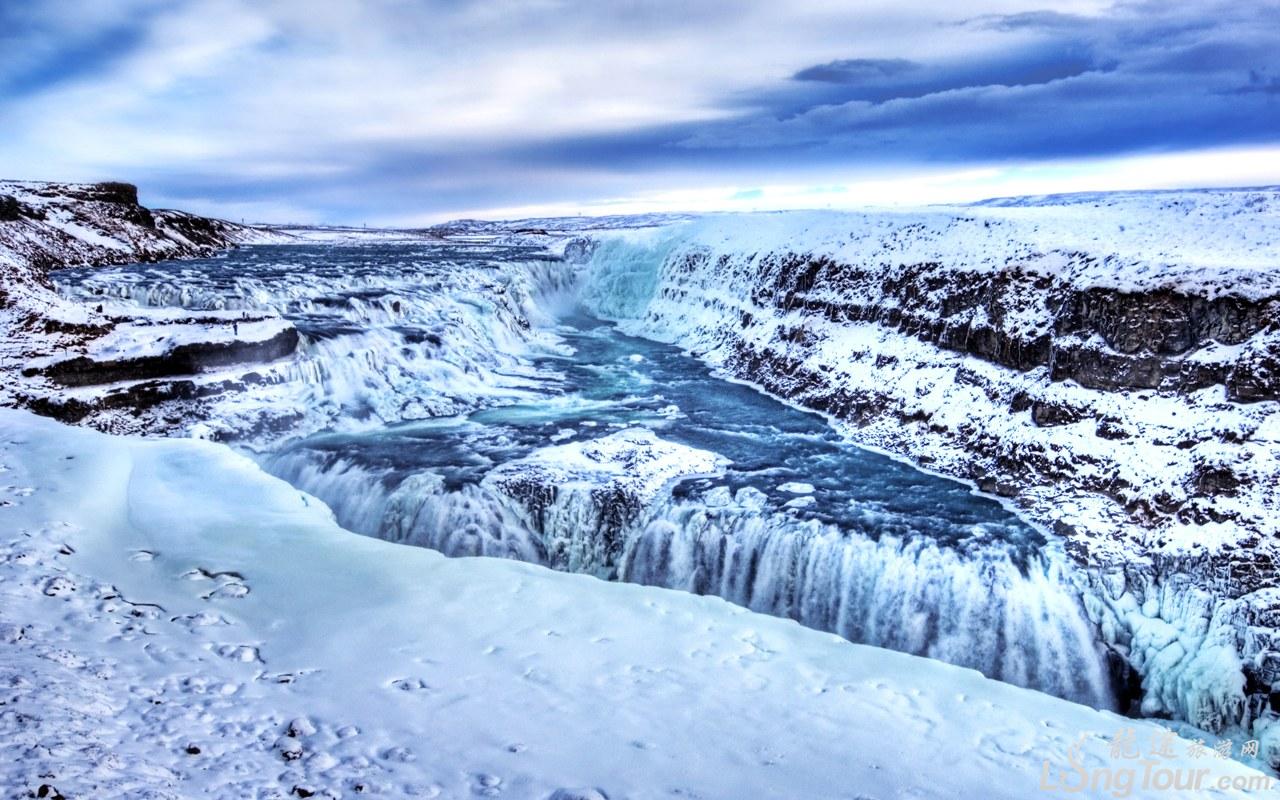 下車時只隱隱聽到水聲。等走到高坡的盡頭,才發(fā)現(xiàn)自己站在懸崖邊上,下面不是峽谷的瀑布。那奔流的瀑布,呈梯級分布,沒有很高的落差,最高只有11米,但它有幾十米寬。水聲轟鳴,峽谷上籠罩著一層薄薄的水霧。因為是冬天,我們看到了連冰島人也少見的景色。往下游傾瀉的瀑布兩側(cè),凍成了晶營透亮的淡藍色冰柱,恰似一幅幅天然玉雕。由于那冰柱是在流動中形成的,極富動感,層次鮮明。