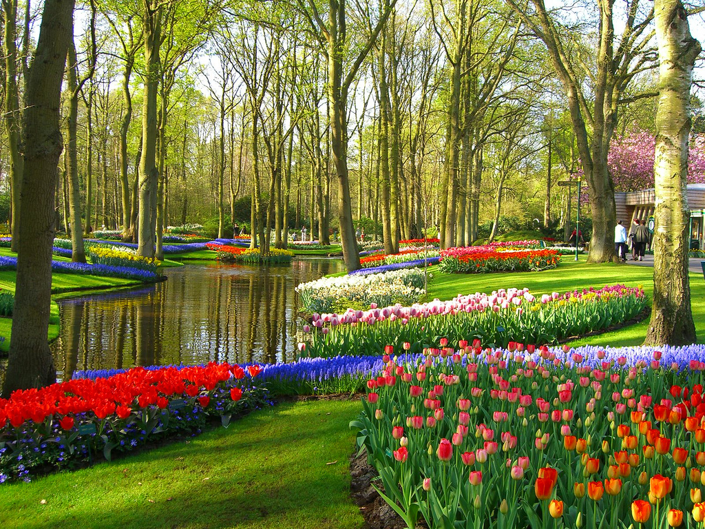 1830年荷蘭聘請(qǐng)德籍的景觀園藝家,設(shè)計(jì)庫(kù)肯霍夫公園(Keukenhof)的藍(lán)圖,公園整體的景觀設(shè)計(jì)以英式的風(fēng)格為主蜿蜒的林徑、幽靜的水池、噴泉交織著一叢叢的花圃,導(dǎo)覽游客參觀各式各樣盛開(kāi)的花卉。