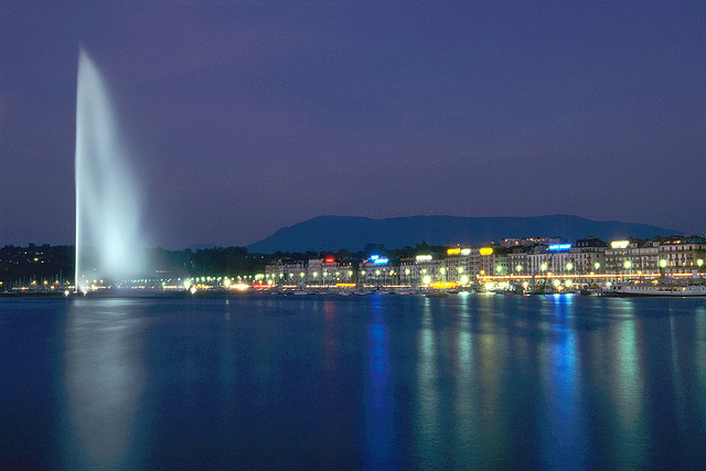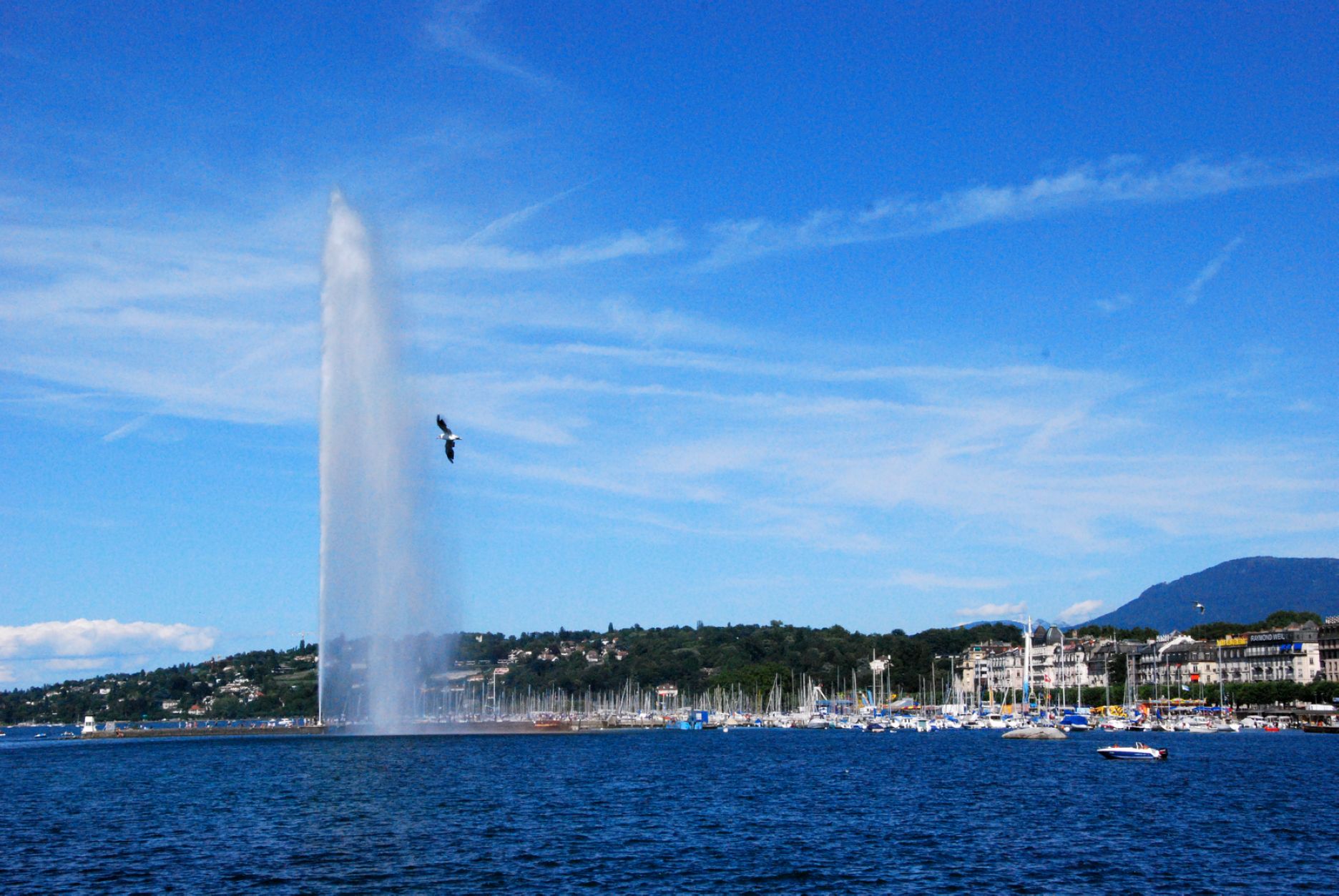 500公升噴水量的噴泉是由130馬力的電力推動為世界上最大的人工噴泉,那沖天而起的高大水柱,從湖面直射天際,蔚為壯觀。這個人工噴泉最初是1891年建成,當時所噴射的高度只有90米。1958年改建后至今。它的動力是兩組安裝在水下的水泵,總重為16噸,由每分鐘達1,500轉(zhuǎn)的500千瓦2,400伏的發(fā)動機帶動。每個水泵的功率為1,360匹馬力,噴泉的流量為每秒500公升,噴口處的水速達每小時200公里,進入噴水管中的水的壓力為16個大氣壓,水柱的高度在無風時可達140米,停留在空中的水量達7噸之多。水從噴嘴噴出達到頂峰再回到水面,每個回合為16秒。日內(nèi)瓦湖是美麗的。自古以來,許多名作家、大詩人都贊美、謳歌過它。亨利•詹姆斯稱它是“出奇的藍色的湖”;拜倫則把它比喻成一面晶瑩的鏡子,“有著沉思所需要的養(yǎng)料和空氣”;巴爾扎克則把它說成是“愛情的同義詞”。其壯觀景象,從日內(nèi)瓦各地都可以望得見,如今大噴泉于每年三月初到十月的第一個禮拜天為止,除了陰雨天之外,每天都準時做“噴水表演”,供民眾參觀。
