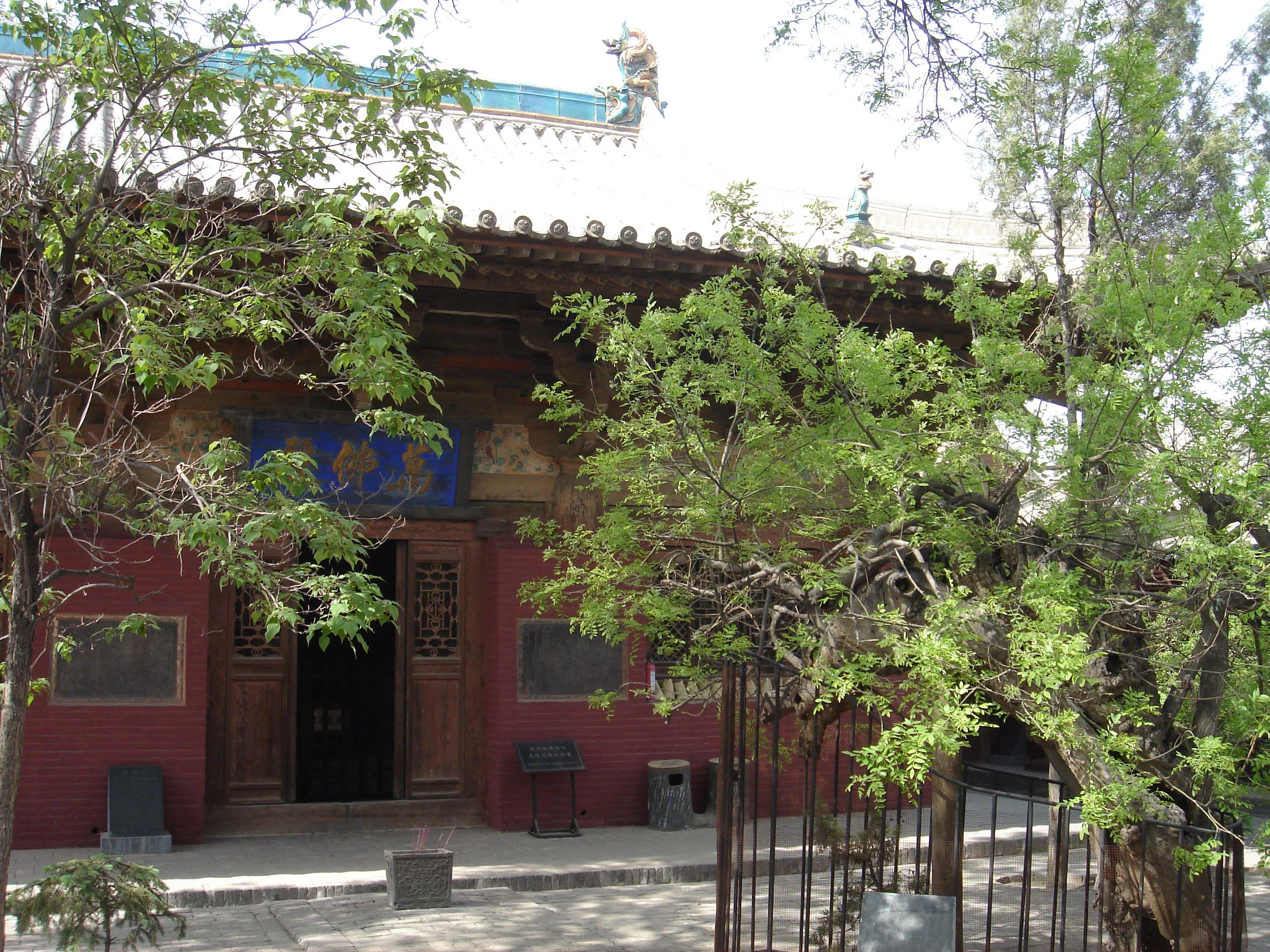 鎮(zhèn)國寺內(nèi)雜樹交蔭,綠葉蓬松,院內(nèi)龍爪槐形似撐傘,枝干曲屈,交織如網(wǎng),頗具古風(fēng),趣味盎然。