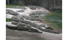 在白藤湖內(nèi)尖峰橋湖心路口即可望到鱷魚島那金碧輝煌,巍峨壯麗的泰式門樓,門前寬廣的停車場可一次性停放上百輛大巴,進(jìn)入大門后,有一個(gè)十分醒目、高達(dá)4米的大型鱷魚雕像——“鱷魚一家”吸收不少游客紛紛在此攝影留念,離雕像百米處,十多個(gè)鱷魚池座落在鮮花叢中、綠茵地上、池中養(yǎng)有我們祖先稱為“噴火龍”、“鮫龍”的楊子鱷、泰國灣鱷、馬來鱷、雜交鱷等四個(gè)品種,大小近千條,最小的有剛出殼的幼鱷,體型最大的有4米多長,重達(dá)千斤。