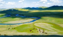 在呼倫貝爾的陳巴爾虎草原深處有一條“天下第一曲水”之稱的莫爾格勒河,金帳汗蒙古部落也位于這里,此地是以游牧部落為景觀的旅游景點。這里是呼倫貝爾有名的天然牧場,每到水草豐美的季節(jié),這里就會聚集很多游牧的牧民,形成一個自然的游牧部落。茫茫大草原上茵茵的牧草,彎彎曲曲的河水,成群的牛羊,點點的蒙古包……構成了一幅完美的草原風情畫。