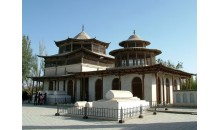 又稱哈密王墓,該陵墓位于哈密市西郊回城沙棗井。陵墓建筑群占地面積約1.3公頃,四周有圍墻。建筑群共分三部分:第一部分膸大拱拜(即回王墳),埋葬著七世回王伯錫爾及其大小福晉,八世回王默哈莫德及其王妃、王族40人。該墓為新疆著名的伊斯蘭建筑,下方上圓,通高17.8米,建筑面積1500平方米,雄偉壯觀素雅莊重。第二部分是南邊的五座亭式木結(jié)構(gòu)小拱拜,東西排列,為歷代回王陵墓。
