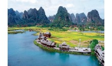 陽(yáng)朔“世外桃源”主要有荷花池、燕子湖、燕子洞、侗鄉(xiāng)風(fēng)情和原始部落組成。若是“沾衣欲濕杏花雨,吹面不寒楊柳風(fēng)”的季節(jié).踏進(jìn)“世外桃源”,展現(xiàn)在眼前的將是一片秀美的山水田園風(fēng)光。清波蕩漾的燕子湖鑲嵌在大片的綠野平疇之中,宛如少女的明眸脈脈含情。湖岸邊垂柳依依,輕拂水面。一架巨大的水轉(zhuǎn)筒車,吱吱呀呀地?fù)u著歲月,也吟唱鄉(xiāng)村古老的歌謠。
