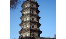 七級(jí)浮屠塔 高約37米,布局為國內(nèi)罕見,正面朝南,緊連磚建硬山式地藏殿。殿前接三間卷棚敞廳,東西兩側(cè)各設(shè)兩層塔式鐘鼓樓。塔東、南、西三面和北面三層以上開窗,余皆在外設(shè)拱形佛龕,塑以生動(dòng)的羅漢浮雕31尊。殿塔相通,供奉三大佛、四菩薩七尊銅像。 塔內(nèi)有木梯,可供登臨觀賞。殿和塔檐下的雀替做成龍、鳳、獅、鶴等浮雕,造型生動(dòng)。塔的局部構(gòu)件和裝飾具有西方建筑的風(fēng)格。