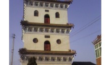 無梁閣位于豐潤縣城南10公里的車軸山頂,又稱壽峰寺,始建于遼重熙元年(1032年),系居士張翁所建。閣建在花崗石臺基上,原為一層,后于重熙六年增建至3層。閣左右各建塔l座,現(xiàn)僅存西面的藥師靈塔,東面(右面)有民國年間所建文昌閣1座。現(xiàn)存閣為明代重建,共3層,每層正面均辟拱形券門,三層建有月臺,環(huán)以漢白玉欄桿。重檐歇山琉璃瓦頂,檐下有磚雕仿木斗拱。