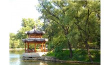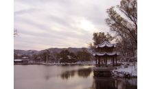 南山積雪亭位于山莊正北、青楓綠嶼南側(cè)的山頂上,是一處借景之作,為“康熙三十六景”第十三景。是山莊的制高點(diǎn)之一。 南山積雪亭為方形四角攢尖式敞亭,面積較大,在此可一覽眾峰?!澳仙椒e雪”是觀賞山莊初冬雪景為命題的一組苑景。塞北高寒,山莊之南,峰嶺環(huán)列,嶺上積雪經(jīng)久不消。登亭遙望,群山上的積雪“皓潔凝映,晴日朝鮮,瓊瑤失素”。直到初春時(shí)節(jié),仍是“不改冰霜積雪冬”的景象。