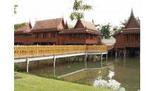 行宮內全部采用柚木所建成的,大片綠色草坪上的柚木行宮,建筑風格很明顯受到歐洲的影響,但基本是還是根據(jù)泰國的傳說來興建的。它使用了金色的柚木,卻沒有一根釘子在上面。柚木里有特別的油脂,而使得它能抗熱和大雨,再加上這種油脂本身還有驅去蟲的功能,更使它成為價值不斐的建筑良材。