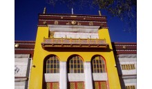 班禪新宮位于扎布倫寺以南,是十世班禪在1954年建造的夏宮,新宮建筑富麗堂皇,十分幽雅,是避暑的好地方。宮內(nèi)放置了很多西藏歷史文物及藝術(shù)精品,尤以一幅《八思巴會(huì)見(jiàn)忽必烈》的壁畫,最為精美。新宮有三道門,第一道門前檐有四根八角朱漆大柱抵頂,門殿浮雕著兇悍不馴的野獸、騰躍欲飛的蟠龍和各種花卉圖案門壁兩側(cè)。彩繪著卷云、猛虎、長(zhǎng)龍、人物和佛教故事壁畫。筆法細(xì)膩,形神俱肖。