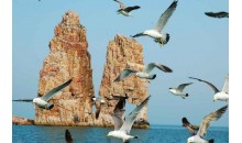 石帆礁海拔204米,是廟島群島的最高點,如同巨大的龍角從大海鉆出,直刺云天,山頂上鷗鳥盤旋、奇石林立,島周圍洞、礁、奇石遍布,并列矗立的姊妹峰巍然不動,在風浪的烘托之下,遠遠望去酷似激流勇進的風帆。