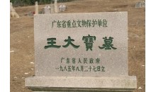 王大寶墓位于潮安縣歸湖鎮(zhèn)神前村的神前山,其地俗稱沉江月,占地約4畝,筑于宋乾道六年(1170)。墓地向西,墓碑高約2.3米,楷書陰刻“宋禮部尚書大寶王公墓”。墓前排列著南宋大型石雕群,計(jì)文武翁仲、石獅、石羊、石筍、石望柱、石馬等14件,石雕線條粗?jǐn)U,工藝簡(jiǎn)練古樸,反映了南宋的雕刻藝術(shù)水平和風(fēng)格,是廣東省現(xiàn)存為數(shù)不多的大型宋代石雕。1989年王大寶墓被列為廣東省重點(diǎn)文物保護(hù)單位。